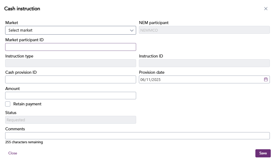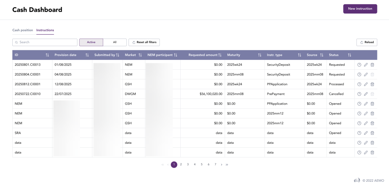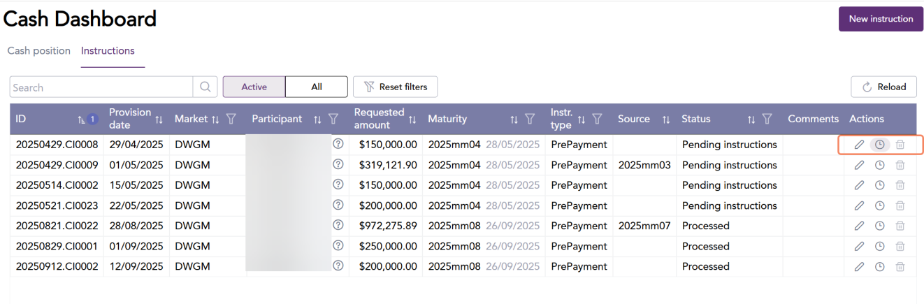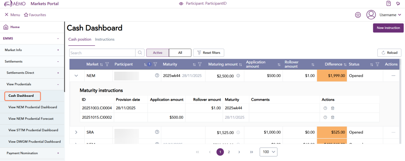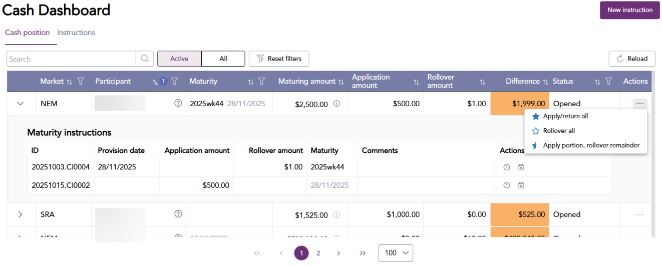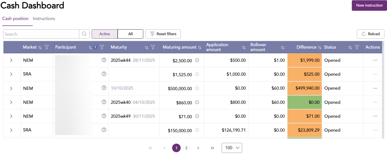 In the cash dashboard menu, you can view the cash position and instructions. Cash position displays a participants current position.