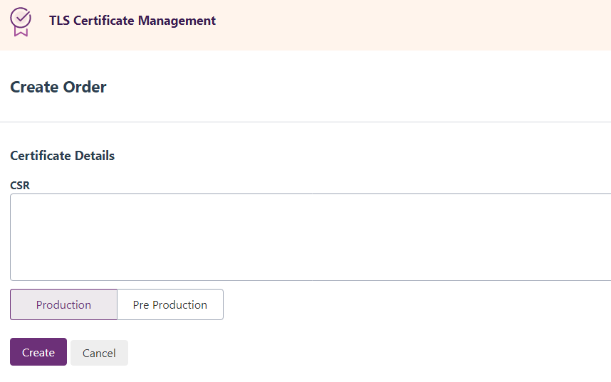 - Obtain a new certificate - Clicking Create Certificate in the upper right of the screen opens the Create Order screen. You provide the CSR Certificate Signing Request is a block of encoded text given to a Certificate Authority when applying for an SSL Certificate. It also contains the Public Key to include in the certificate. Usually, a Private Key is created at the same time, making a Key Pair. and select either Production or Pre-production AEMO’s test system available to participants to create the certificate for the selected environment.