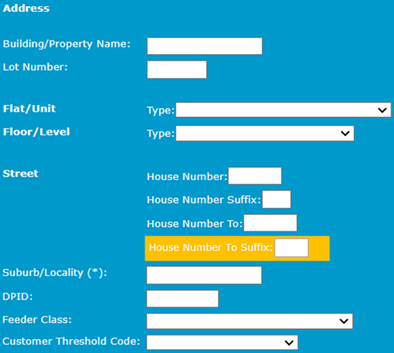 For CR Change Request 2000 and 5000 series, in the Change Request A transaction submitted by participants in MSATS whenever they want to create or update data held in MSATS. – [New/Edit] – NMI Standing Data interface, there is a new HouseNumberToSuffix text box in the Address section.