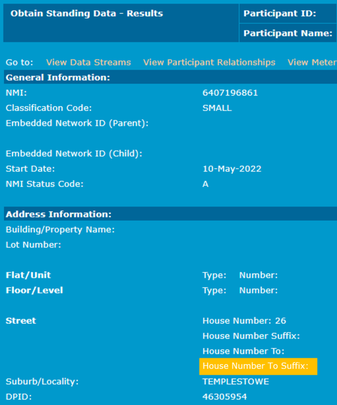 Where a NMI currently has a value for HouseNumberToSuffix, participants can submit a NMIStandingDataRequest transaction and receive a NMIStandingDataResponse with the HouseNumberToSuffix element and value, if they have the following: