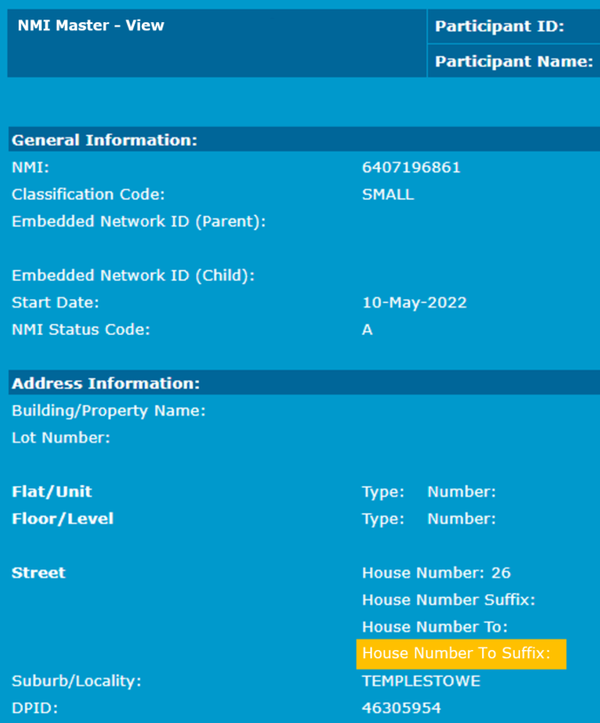 For participants with a role against the NMI, the NMI Information> NMI Master > NMI Master – View interface includes a label for HouseNumberToSuffix in the Address Information section.