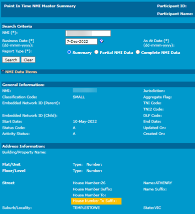 For participants with a role against the NMI, the NMI Information > Point In Time NMI Master Summary interface includes a label for HouseNumberToSuffix in the address information section: