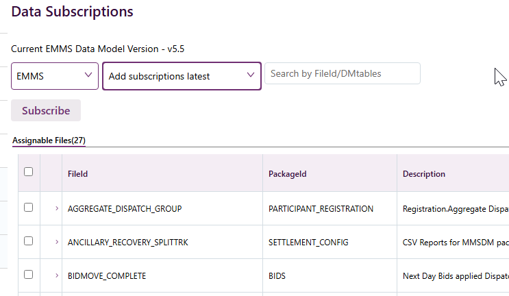 Participants using the Data Interchange A set of cooperating applications used to replicate data between AEMO's energy market systems and a participant's DBMS conforming to the MMS Data Model. should subscribe to the latest file IDs using Data Subscription A web application in the Markets Portal used to subscribe to Data Interchange files and to obtain the latest MMS Data Model. These files are typically csv files containing public data and participant’s private data. AEMO recommends participant use of the Data Interchange suite of products, supplied by AEMO, to automate receiving and storage of the files to their systems. AEMO provides working sample software for FTP access (Participant Batcher) to MarketNet and working sample software for Data Interchange. in the Markets Portal Web applications for registered participants only. Requires access to MarketNet..